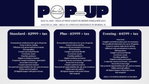 Couples who want a meaningful, stylish ceremony without months of planning. Whether you’re eloping, renewing your vows, or simply celebrating your love with a select group of loved ones, this pop-up wedding is for those who cherish elegance, joy, and unforgettable moments.
